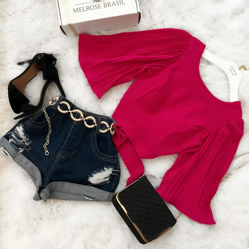 CROPPED LUANE NO CREPE DUNA/POSSUE BOJO/MANGA PLISSADA.Possue bojo.costas com amarração do próprio tecido podendo regular de acordo como o corpo.Lindo!